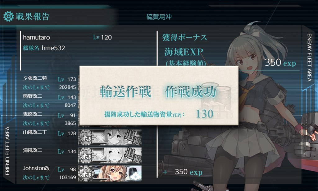 いつもの輸送マップ。いつもより大発艦が余っていて選び放題。E5の輸送同様に事故もほとんどなく、安定してました。
