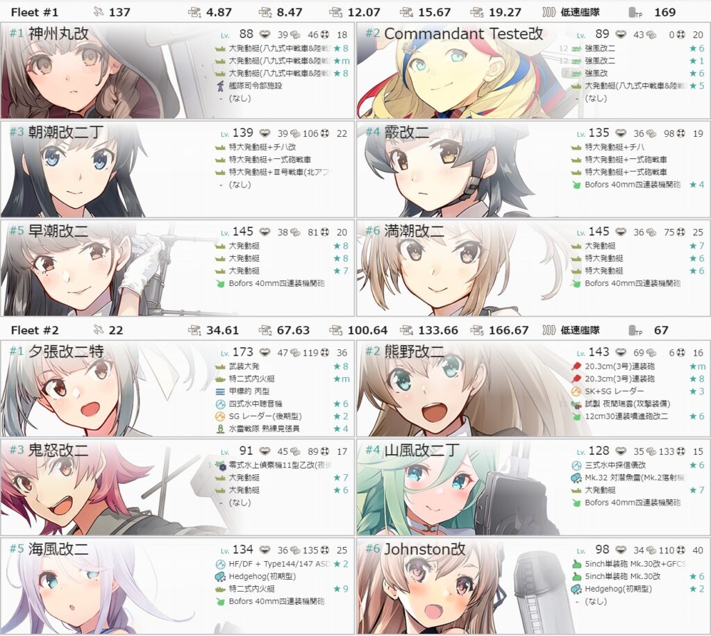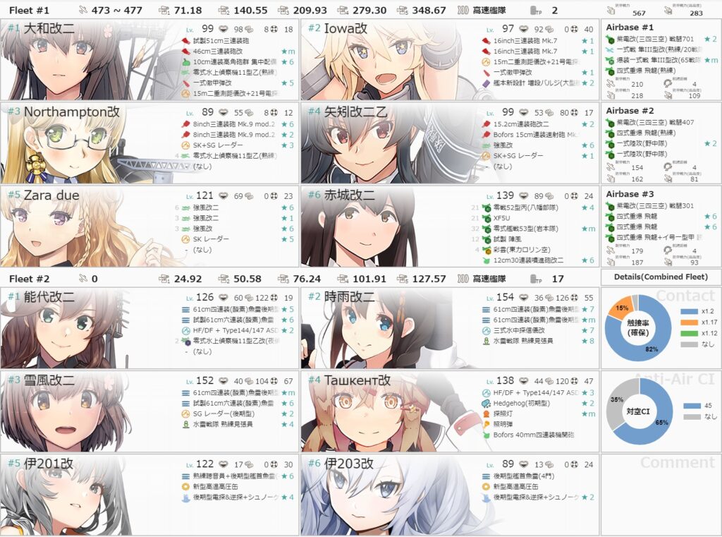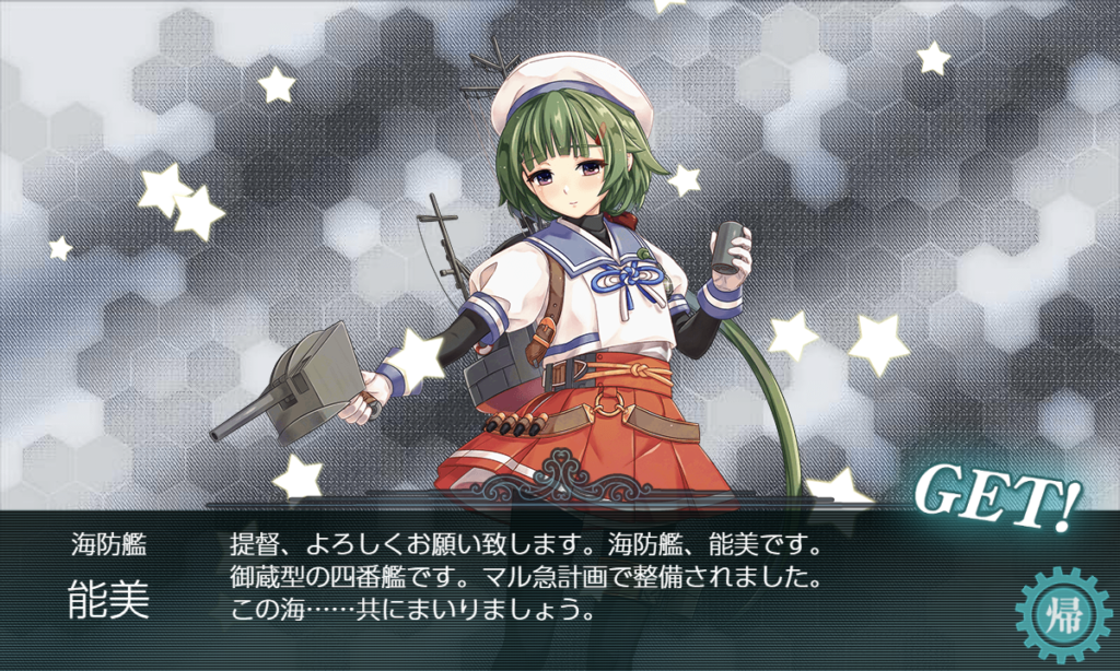 二水戦札で集積地さんを燃やすマップ。ここで能美さんがドロップして新艦はコンプ。非常に珍しいことではありますが、攻略中にすべての新艦が揃って掘り免除となりました。