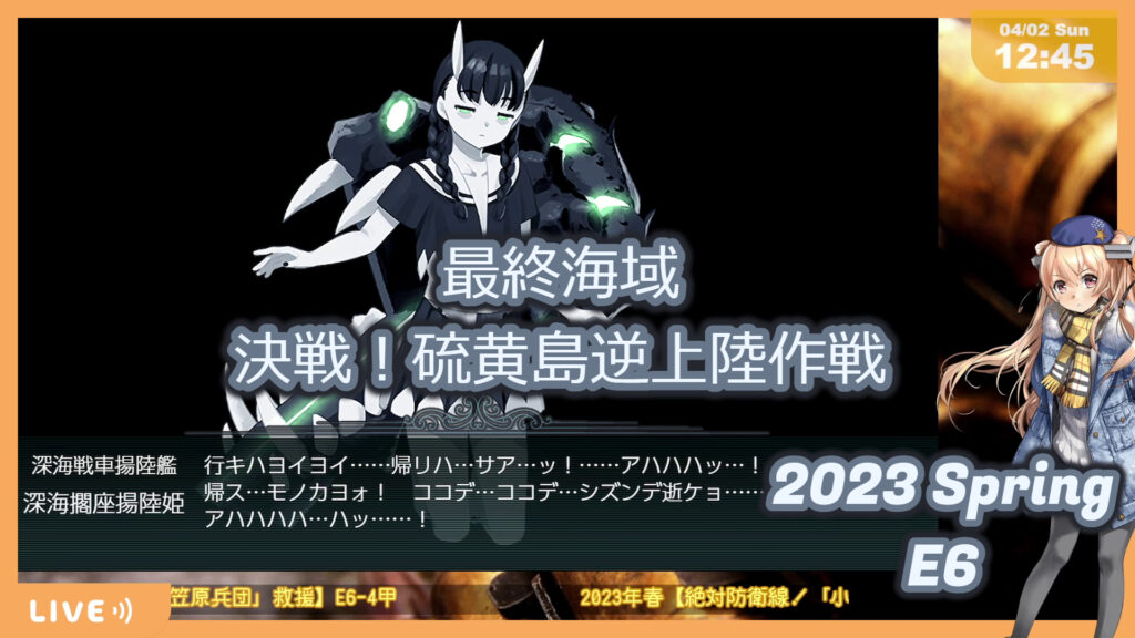 いよいよ最終海域のE6へと入っていきます。E5-3をクリアしたあたりで月が替わり、前段にようやく友軍が到着というタイミングでした。4月1日にあったこととして、毎年恒例になりつつある今後の予定的なもののツイートが大量に流れて来ました。もうキャンペーンが始まっている某L社さんとのコラボの話の反響が大きかった様子でしたが、改装予定のスケジュール的なものの話もありました。