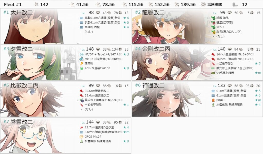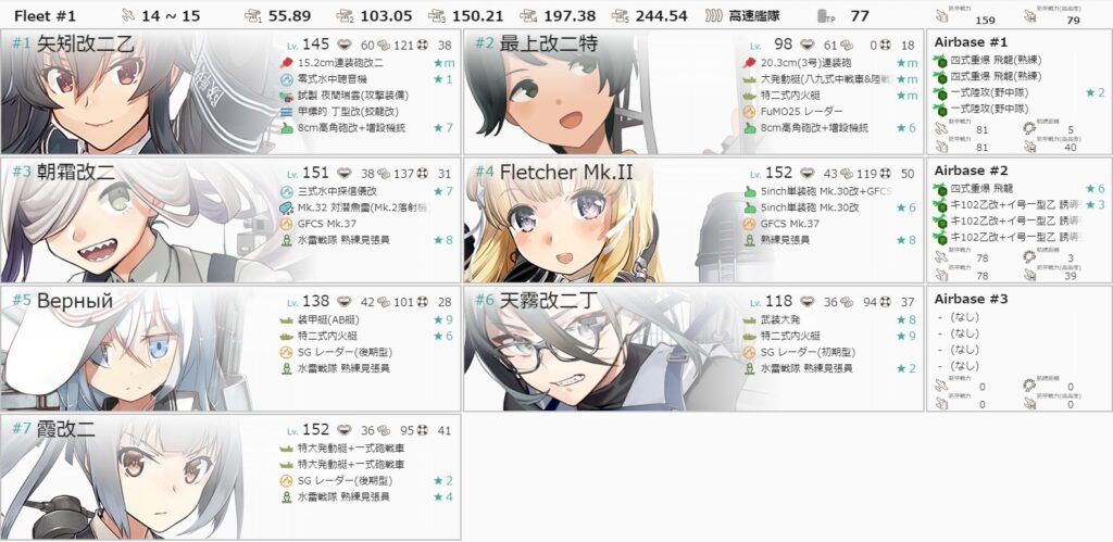 後段最終海域としては珍しく基地航空が使えないマップが登場。これは賛否が分かれるところかと思いますが、ここまでの資源消費量を考えると嬉しいかなと素直に思いました。編成も遊撃部隊を使うことになるので低コスト。札の制限もきつくないので選び放題。ただ、油断するとやられるので要警戒。という感じでした。