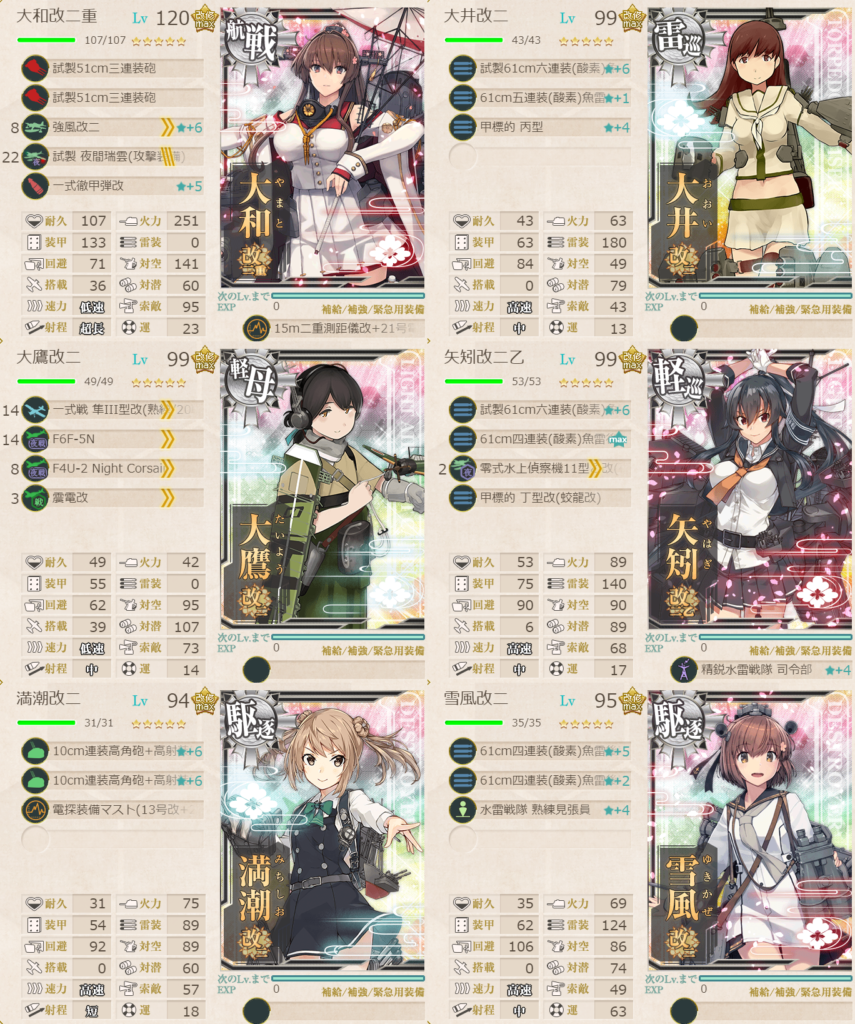 削り中からネ改が猛威を振るって被弾多数。最初は主砲メインの装備だったゆっきー、矢矧に魚雷を装填。生き残った艦でスナイプ勝負のとてもきつい戦い。道中大破は事故と割り切りました。ラスダンの試行回数10回以内で済んだので良し。第二艦隊の札はE3でも使うので大和、ゆっきーを切ったことについては問題なし。