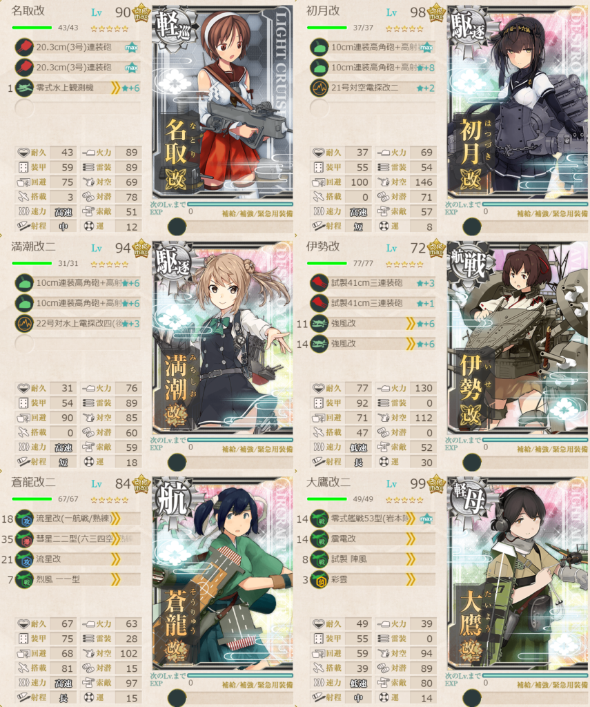 次の海域が大井っちに特効がある模様。メインは切っていないのでまだ許容範囲だけどどうだろう。みっちーと初月の交代をもう少し早く判断するべきだったかも。制空、対潜担当の大鷹が地味にいい仕事をしていました。