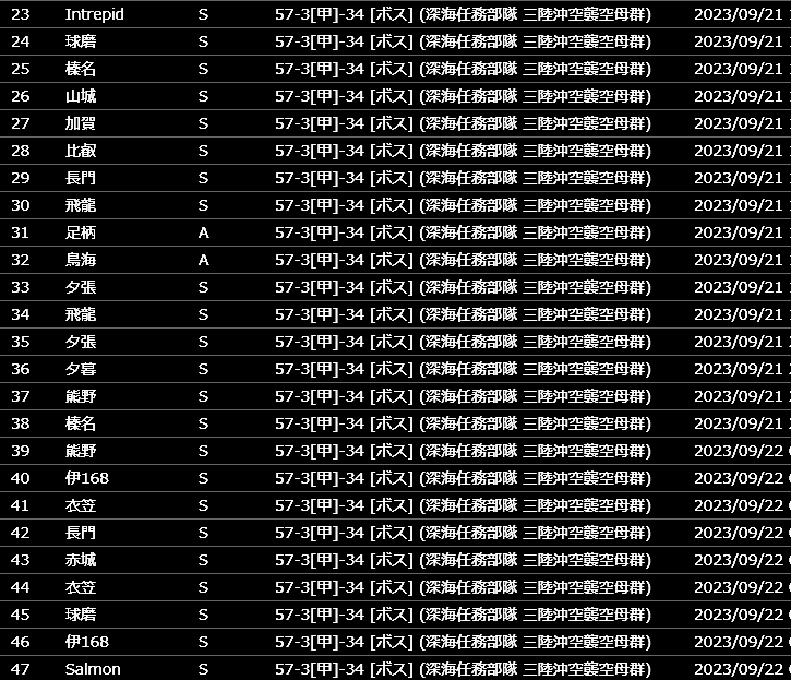 カッペリーニまでは結構早くドロップしましたが、3-3のsalmon掘りは若干深いところにいる感じで翌日回し。無事ドロップしました。初手でIntrepidドロップ。