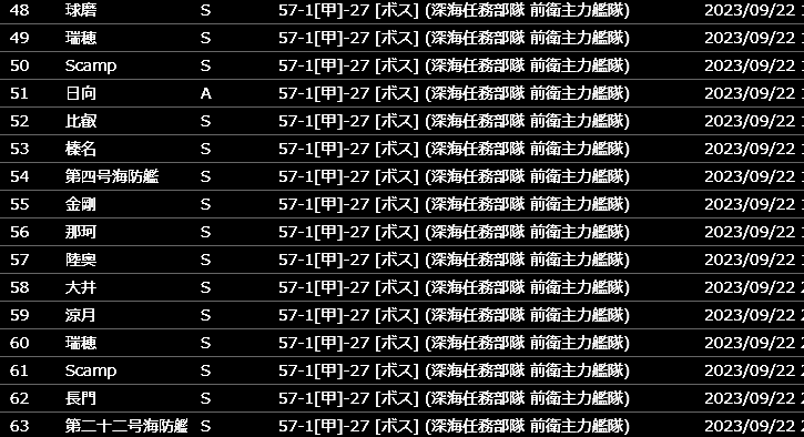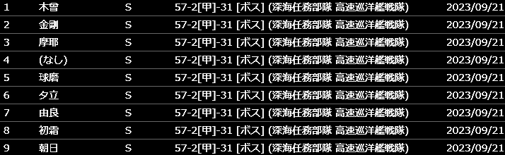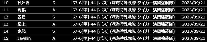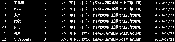 攻略中に新艦は一隻も出ませんでした。掘り周回を開始したのは9/21未明から。100周以内で新艦を全て揃えることができました。まるゆ以外のコンプリート継続です。