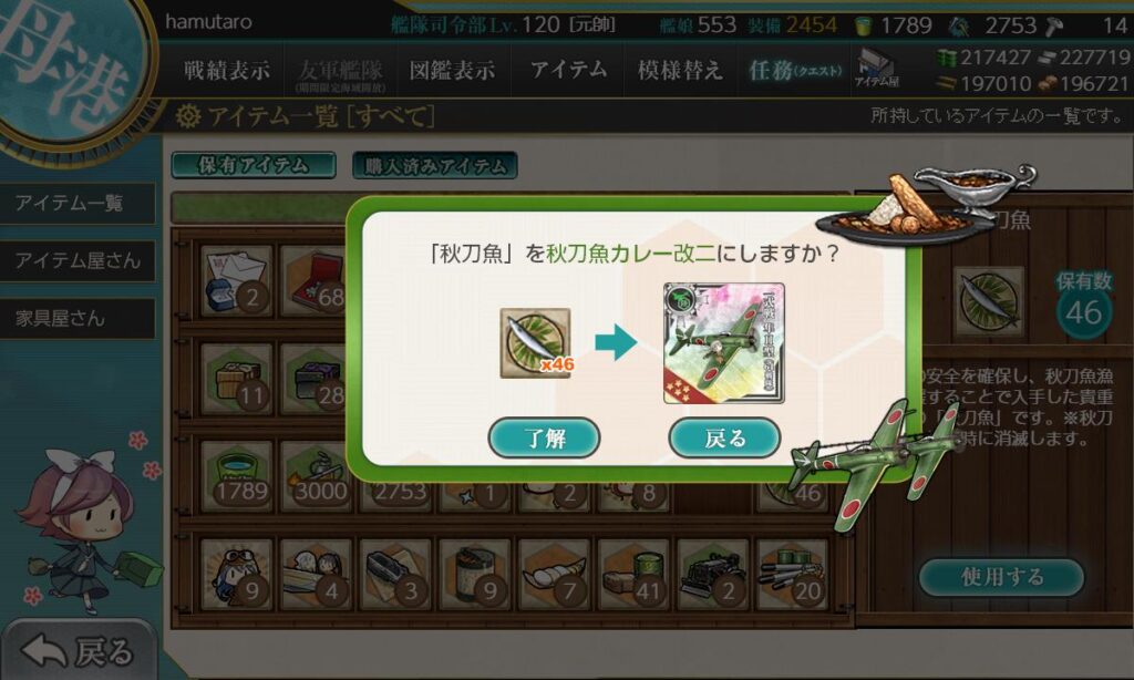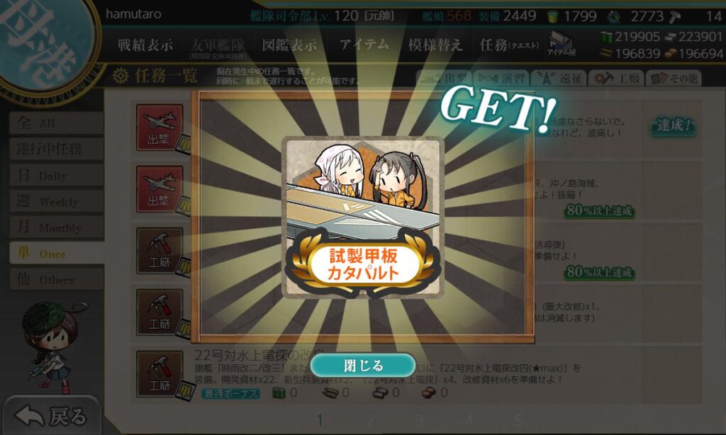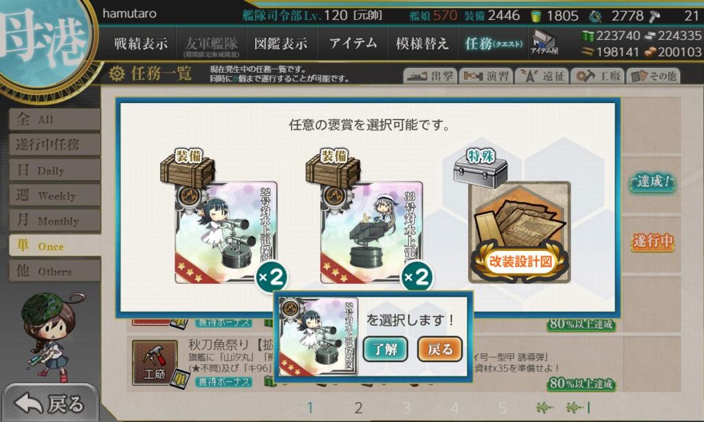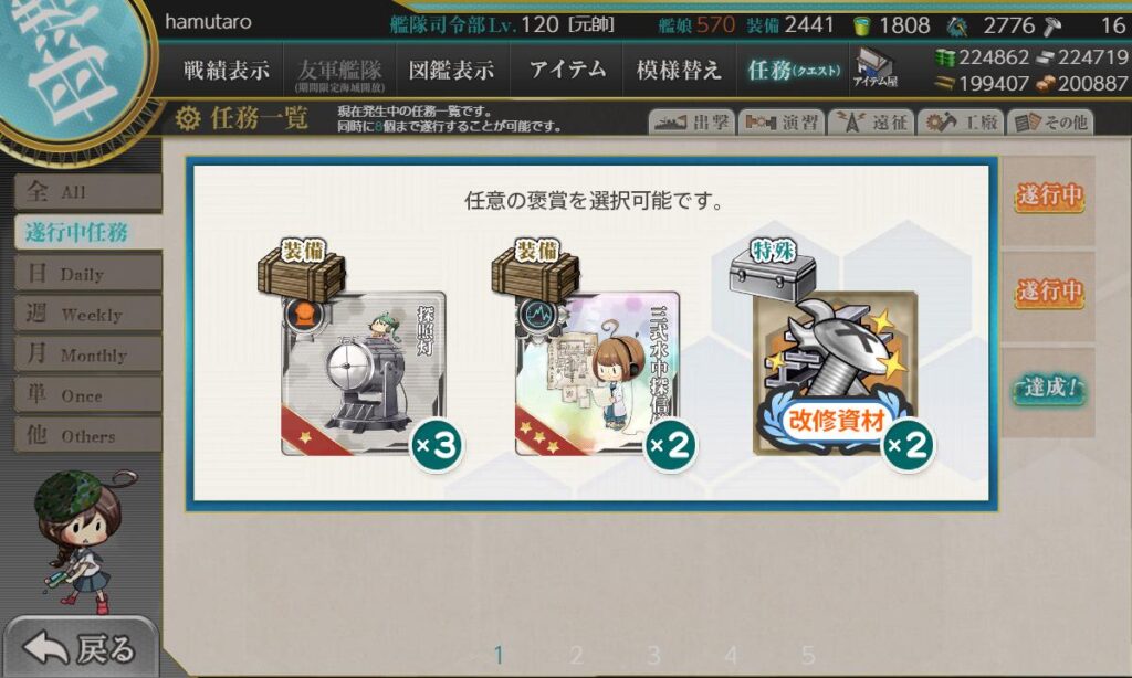先月の戦果報酬でいただけた装備に改修がきて、潜水艦系の装備のテコ入れが入った感じですね。今すぐ急いでやる必要はなさそう。優先順位的にはかなり低めかなー。