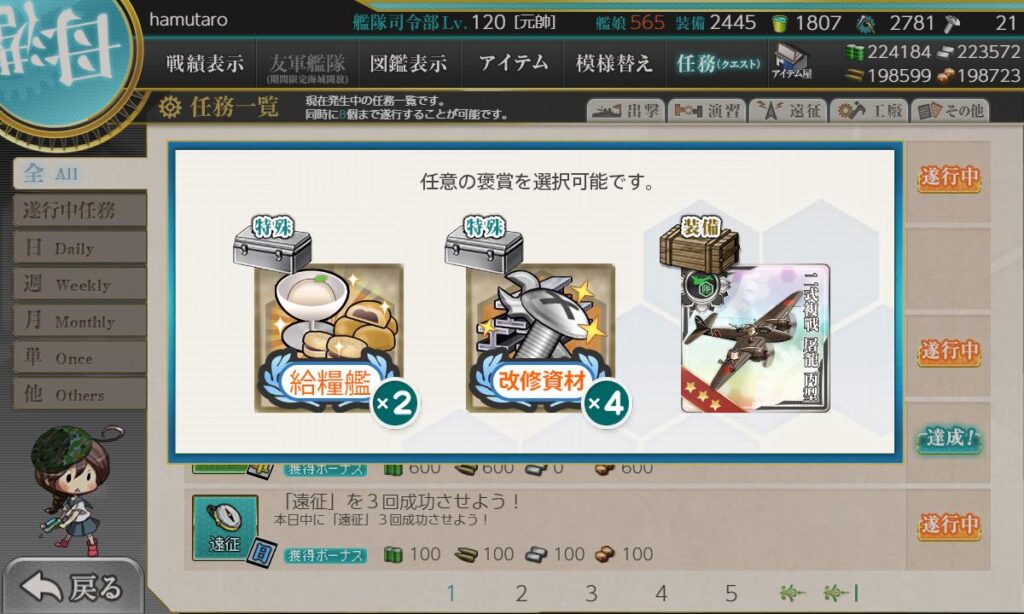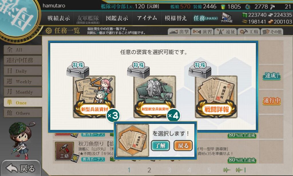 二式複戦 屠龍 丙型と勲章を選択。屠龍丙型はなくても差し支えなかったのですが、過去の改修素材に使用していなくなっていたので再取得。山汐丸も熊野丸も1隻いればいいかなぁ。という感じ。