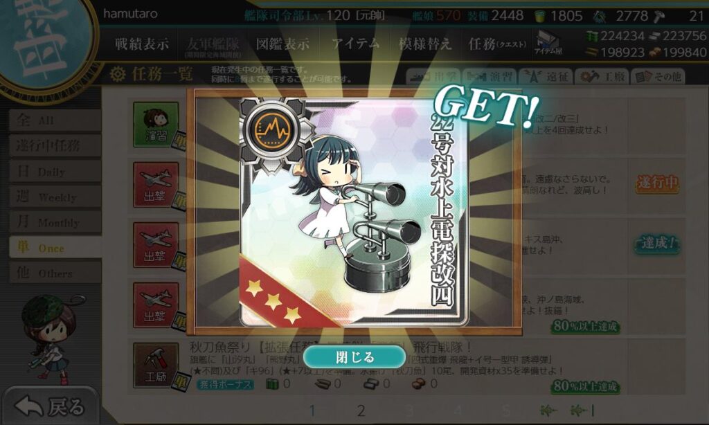 前回もらえたつよつよ電探【逆探(E27)+22号対水上電探改四(後期調整型)】が早くも改修できるようになりました。ただ、素材が現状では入手が難しい22号対水上電探改四。今回の任務ツリーで最大3つもらえます。あとは次の入手手段が増えるのを待つか、いよいよ鳥海牧場か。というところですが、こちらは焦らないで待ってもいいかなと考えています。前回の単発任務を保留したのは正解だったかなと。