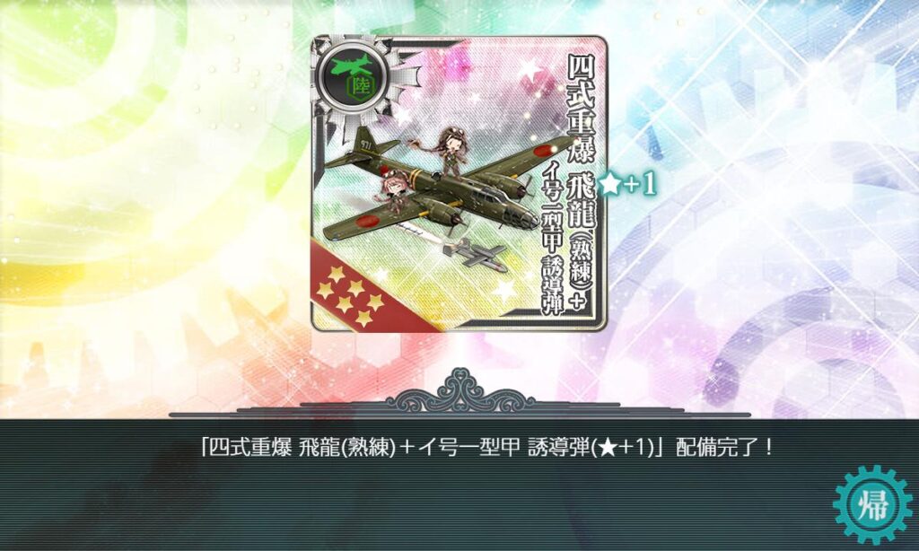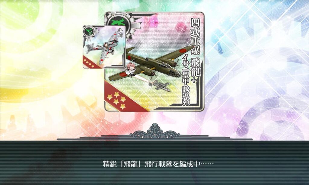 ・山汐丸、熊野丸、朝日のいずれか旗艦で、四式重爆 飛龍+イ号一型甲 誘導弾,キ96☆7(以上), 秋刀魚10尾, 開発資材35を準備し達成。