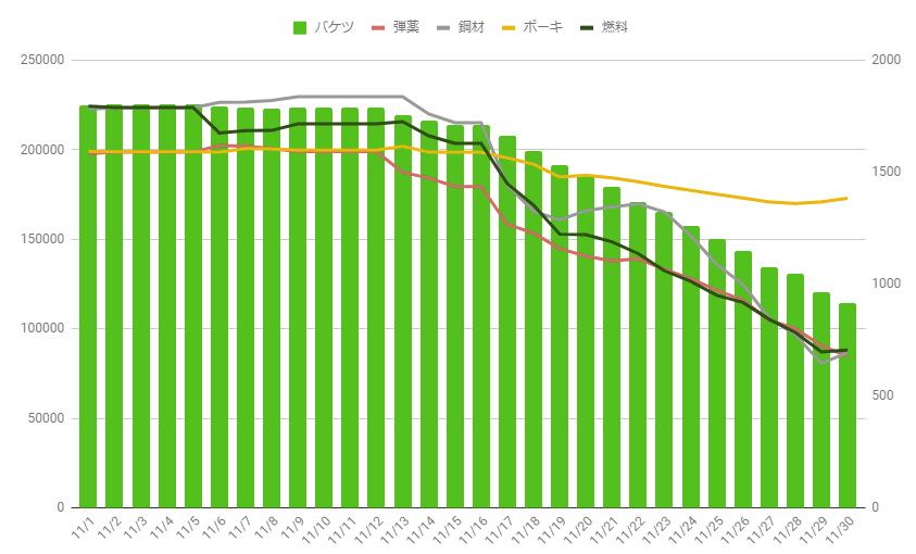 いろいろな編成を試して、ボーキを維持しつつ他を減らす戦略を取りました。