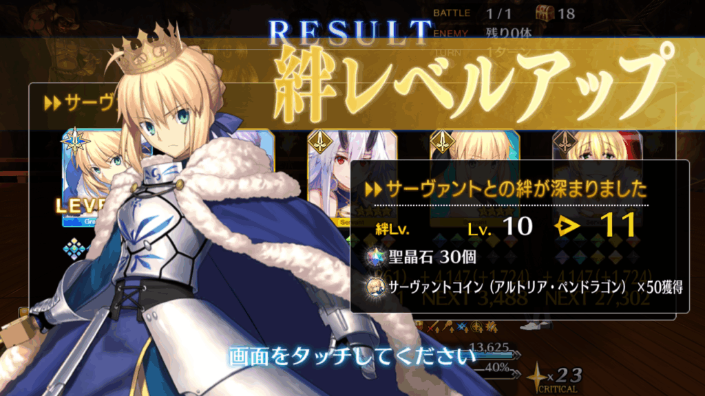 その後も夢火を入れて絆11を目標に再設定して周回を継続することに。フレンドさんに仕上がっているアルトリアがたくさん上がってきたので、【宝具+Buster+Buster+ExAttack】の形を作って1~2ターンで周回する戦法が回りやすくなりました。難易度100☆1でもどんどん絆やらマスターレベルやらいろんなものがぐんぐん上がって、いくらでも回れそうでした。うちの宝具1アルトリアでもⅠターン突破できることもあるのがびっくりでした。
