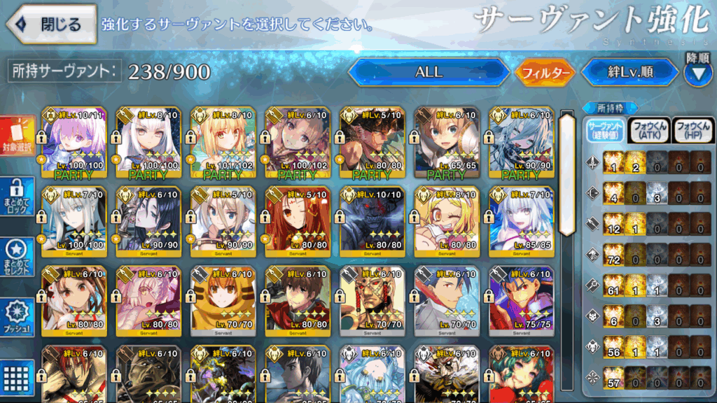 現在の絆仕上がり具合。マシュとランサー、バーサーカーをピックアップしてみました。グランドは宝具1でも戦えそうなのでそこは基準から外してもよさそうかなと。次回からは絆も大事だけど目標をマスターレベルで設定しようと思っています。年末にはLV170くらいまでいけるといいな。