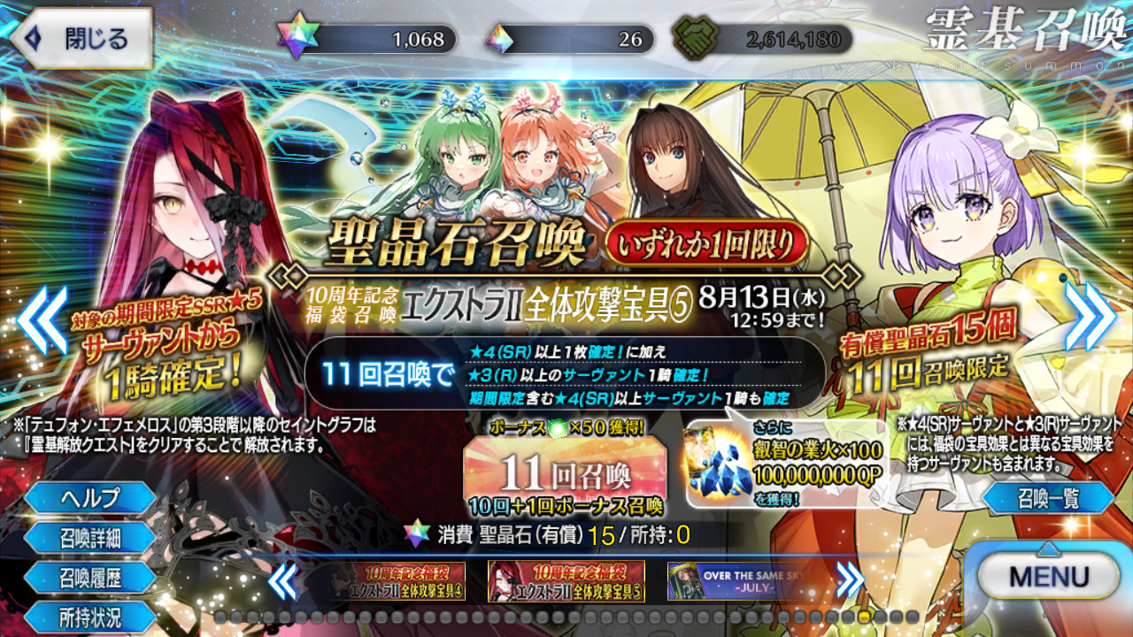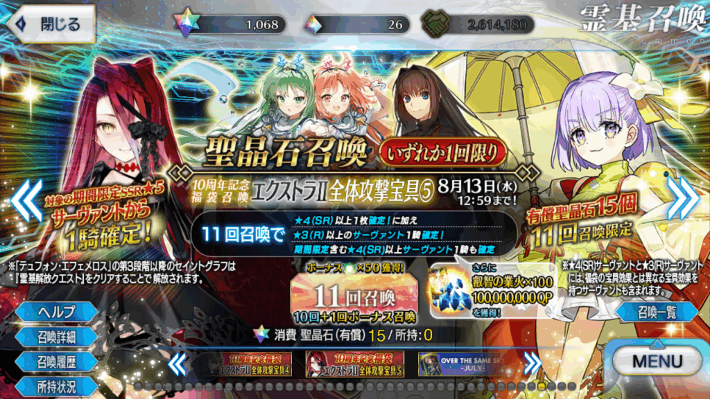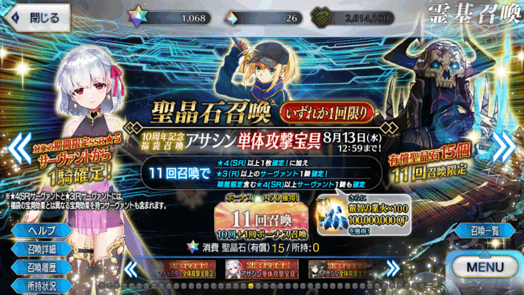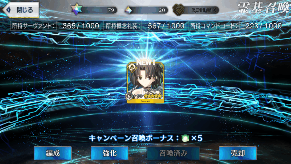 準備段階として、タイトなスケジュールの隙間を縫って未消化のフリークエストを片っ端からこなして少しずつ石の貯金を増やしていました。周年を迎えた時点でボーナスと合わせて1500個くらいに。所長ピックアップが来てからは勢いでガチャ回しました。(ここぞという時のノリと勢いを大事にするのがモットーなので。)特に欲しかった鯖は引き終わっていたので新規は極力狙わずに既存の鯖を重ねる方針でした。