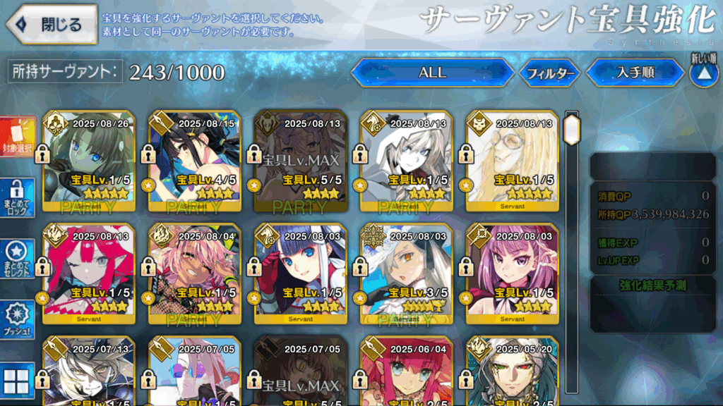 2025年8月に引いた新規入手鯖は9騎。うち所長が3凸、式さんが出るまでに美遊ちゃんが4凸って所ですか。石1000個が速攻でなくなるわけです。