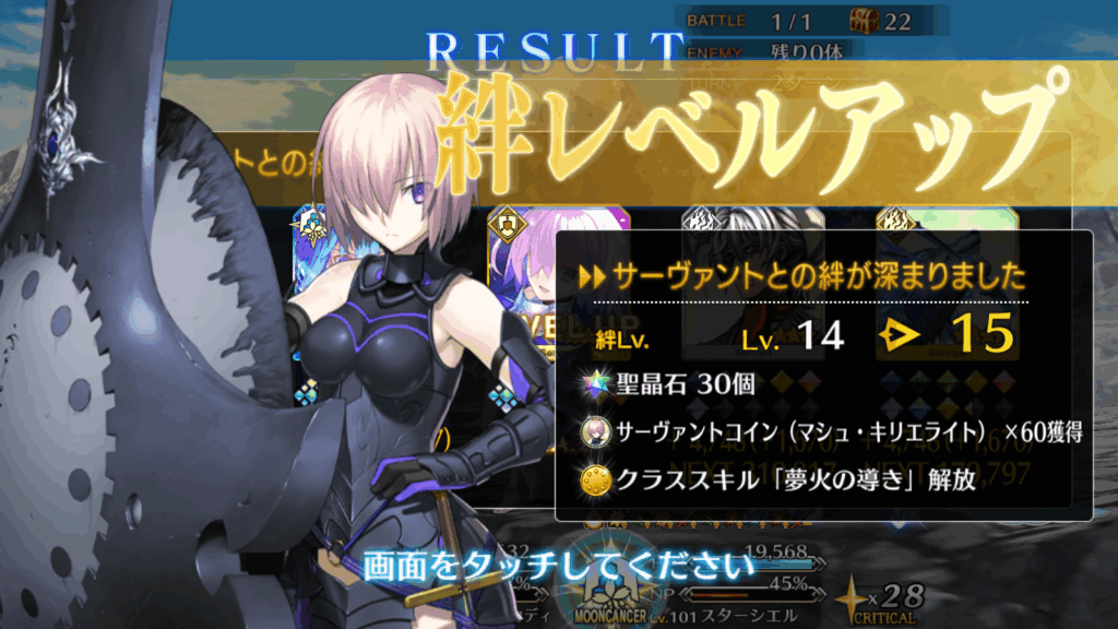 目標として、当初は夢火を入れた鯖をひとつでも多くレベルを上げることでしたが、のちの絆ボーナス効果の大きさを考えてマシュの絆15をめざしました。