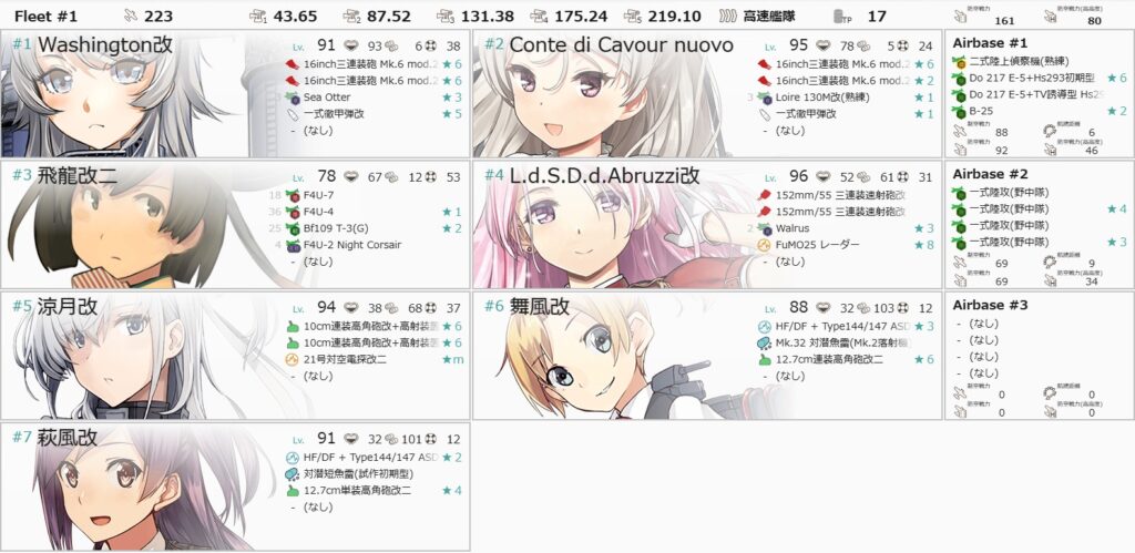 Pマス回避の上ルート。駆逐7の高速統一、秋月に対空、Maestrale、Johnstonに対潜、カットインを極力並べる形。基地:1部隊ボス、1部隊防空(固定)、支援:対潜、決戦あり。全サブ艦。